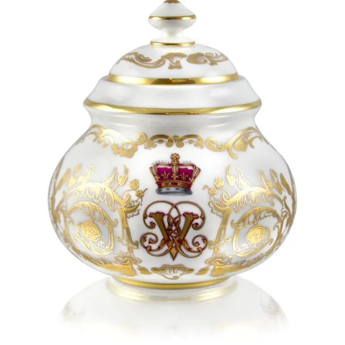 This Covered Sugar Bowl Is Part Of The Victoria And Albert Chinaware Collection. At The Centre Of The Sugar Bowl Is The Cipher Of Queen Victoria And Prince Albert Surmounted By The Royal Crown. The 22 Carat Gold Surrounding Detail Is Inspired By The Foliate Scrolls, Shamrocks, Thistles And Rose Sprays Found On The Original Worcester Plate Made In 1840.