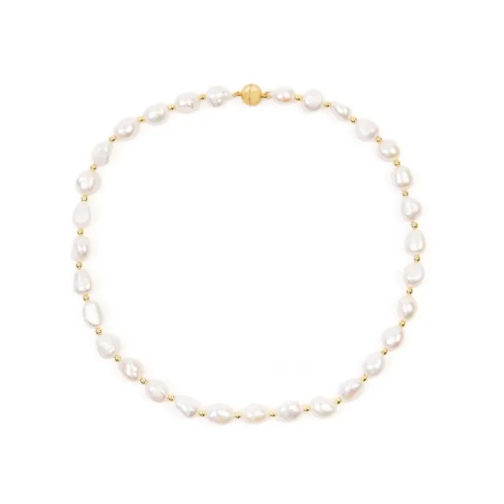 A Feminine And Elegant Necklace Of 10-11Mm Baroque Pearls Interspersed With Small Round Gold Plated Hematite Beads, On A Gold Plated Magnetic Ball Clasp.