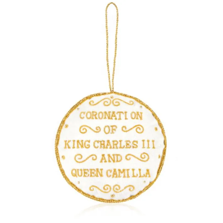 Treasure The Memories Of King Charles Iii’S Coronation With This Elegant, Handmade Decoration. At The Centre Of The Decoration Features Their Majesties’ Entwined Cypher Embroidered In Glistening, Gold Threads. Surmounted With A Crown, The Cypher Is Surrounded With Oak Leave Signifying Strength. The Entwined Ribbon That Decorates The Edge Of The Roundel Decoration Represents The Supportive Partnership Between The King And Queen.